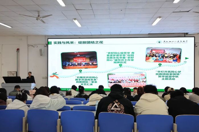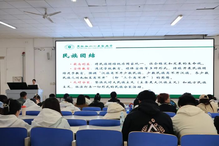 为使2025级新生深入了解国家民族宗教政策,铸牢中华民族共同体意识,10月12日,公司面向2025级新生开展民族团结进步教育专题讲座。本次讲座由辅导员王明瑶、杨赫、毛叶·阿拜共同主讲,全体2025级新生参加。