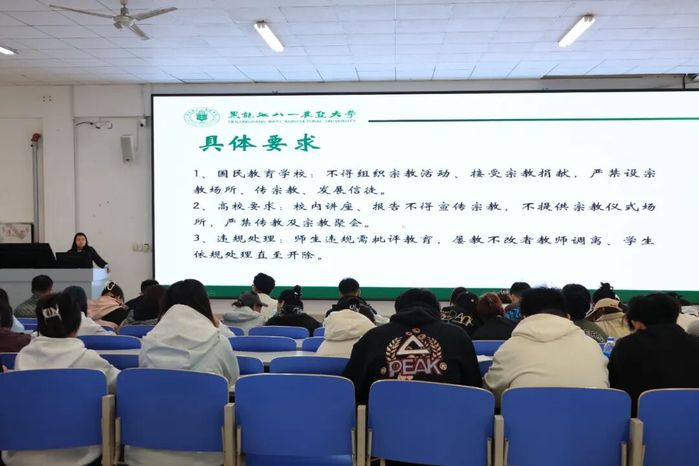 随后,杨赫聚焦我国的宗教政策进行了深入解读。她详细介绍了国家保障公民宗教信仰自由、依法管理宗教事务、坚持独立自主自办原则等基本方针,强调了在校园生活中正确认识和对待宗教问题、自觉抵制非法宗教活动的重要性,帮助同学们树立正确的宗教观。