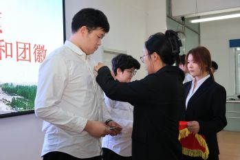 仪式在庄严的国歌声中拉开帷幕。主持人梁海晨同学宣读了2025年下半年新发展团员名单。随后,王明瑶为新团员颁发团员证并佩戴团徽。