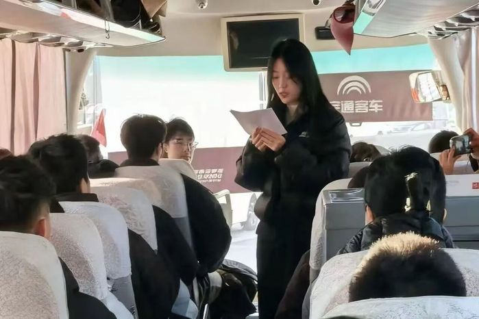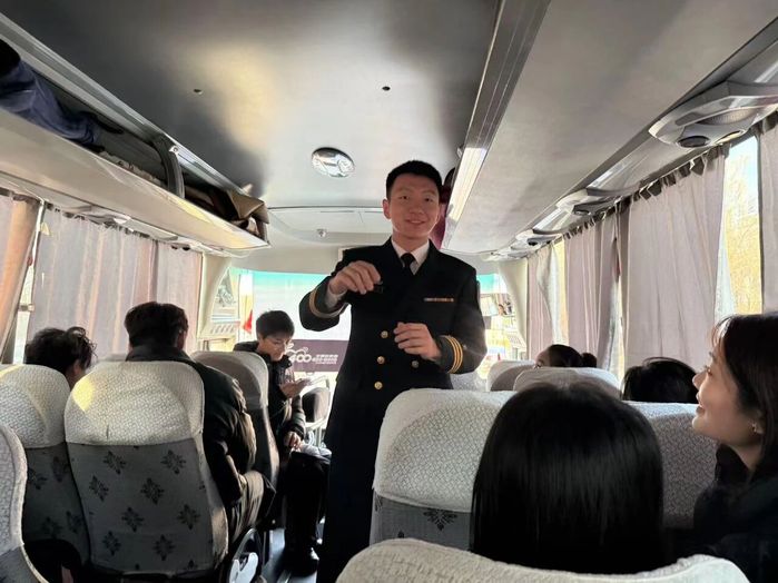 乘车途中,主持人张娜介绍了活动的筹备过程与主旨意义。公司红色精神讲解员孟凡格为大家讲解了铁人王进喜纪念馆的建馆背景与展陈概况,为接下来的参观做好充分准备。随后,退伍士兵李俊洁带领大家齐唱《我为祖国献石油》《歌唱祖国》《强军战歌》《团结就是力量》等红色歌曲。歌声嘹亮,情感真挚,车厢内气氛热烈,各族师生在激昂的旋律中进一步增强了集体认同与民族情感。