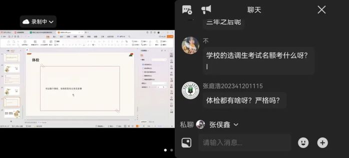 答疑环节持续近40分钟,同学们通过聊天框踊跃提问:“选调生两年后能调岗吗?”“体检项目与标准如何?”“黑龙江哪些地区竞争较小?”耿浩伦逐一耐心解答,提供中肯建议。互动区内实时滚动的提问,体现同学们对基层就业的关注。